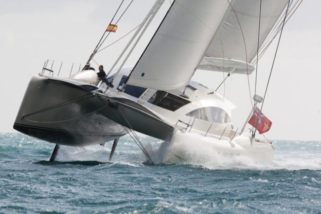 A world cruising catamaran with a dark-side. In 13 knots she can fly a hull – get your head around that! That’s Hobie territory….